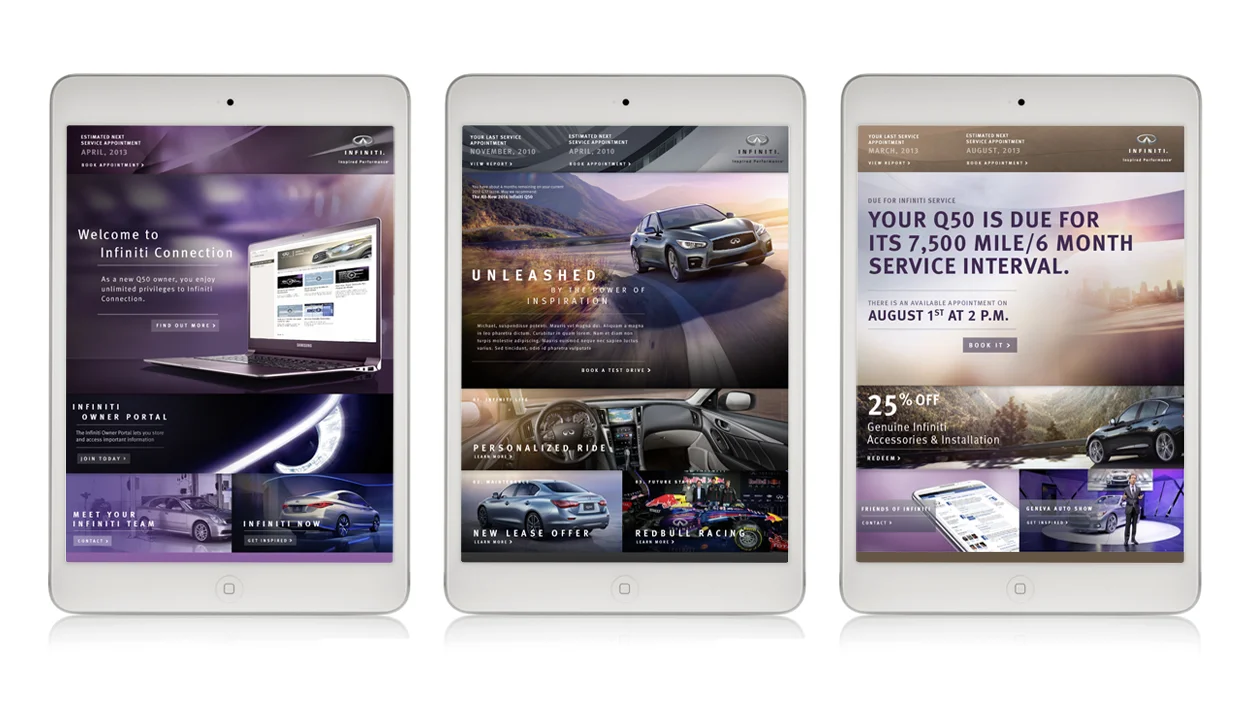 Once we get a customer's info into the Infiniti database, we start communicating with them right away. I helped create this digital CRM program that serves up information relative to that reader, whether they are a prospect, an owner looking for maintenance schedules, or a lessee looking for info on the latest and greatest from Infiniti.