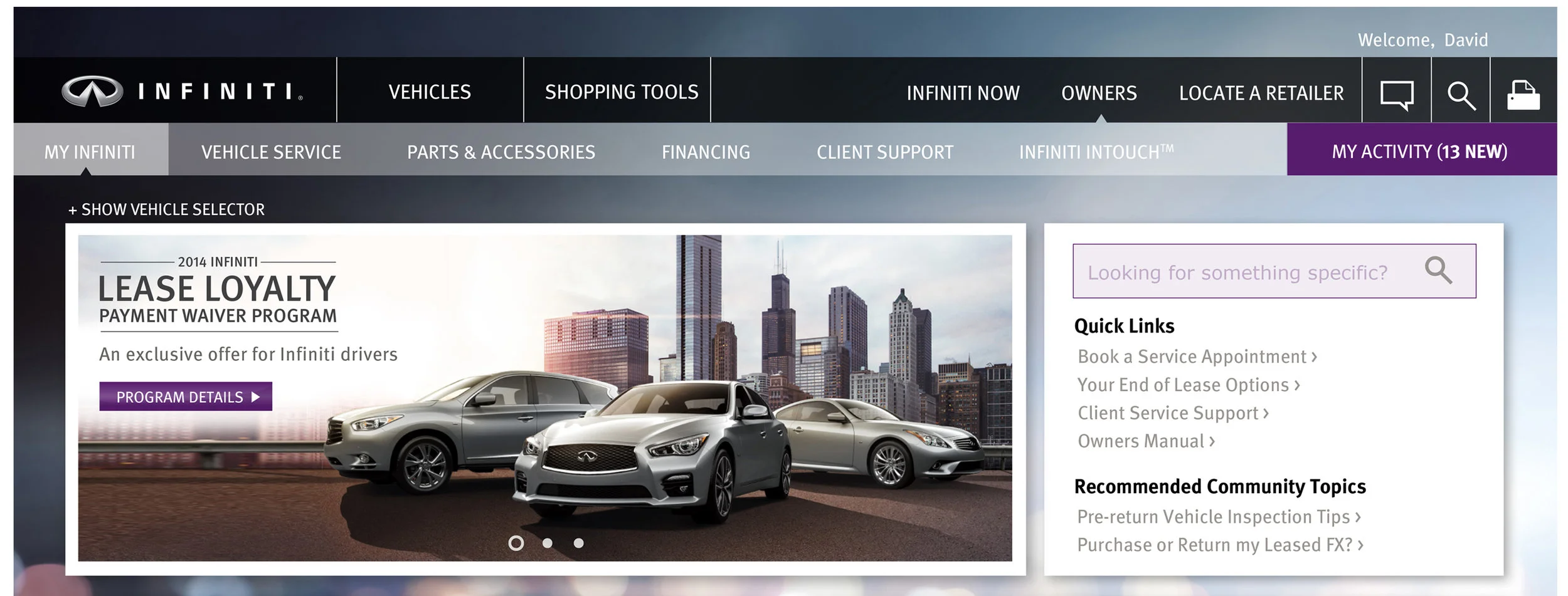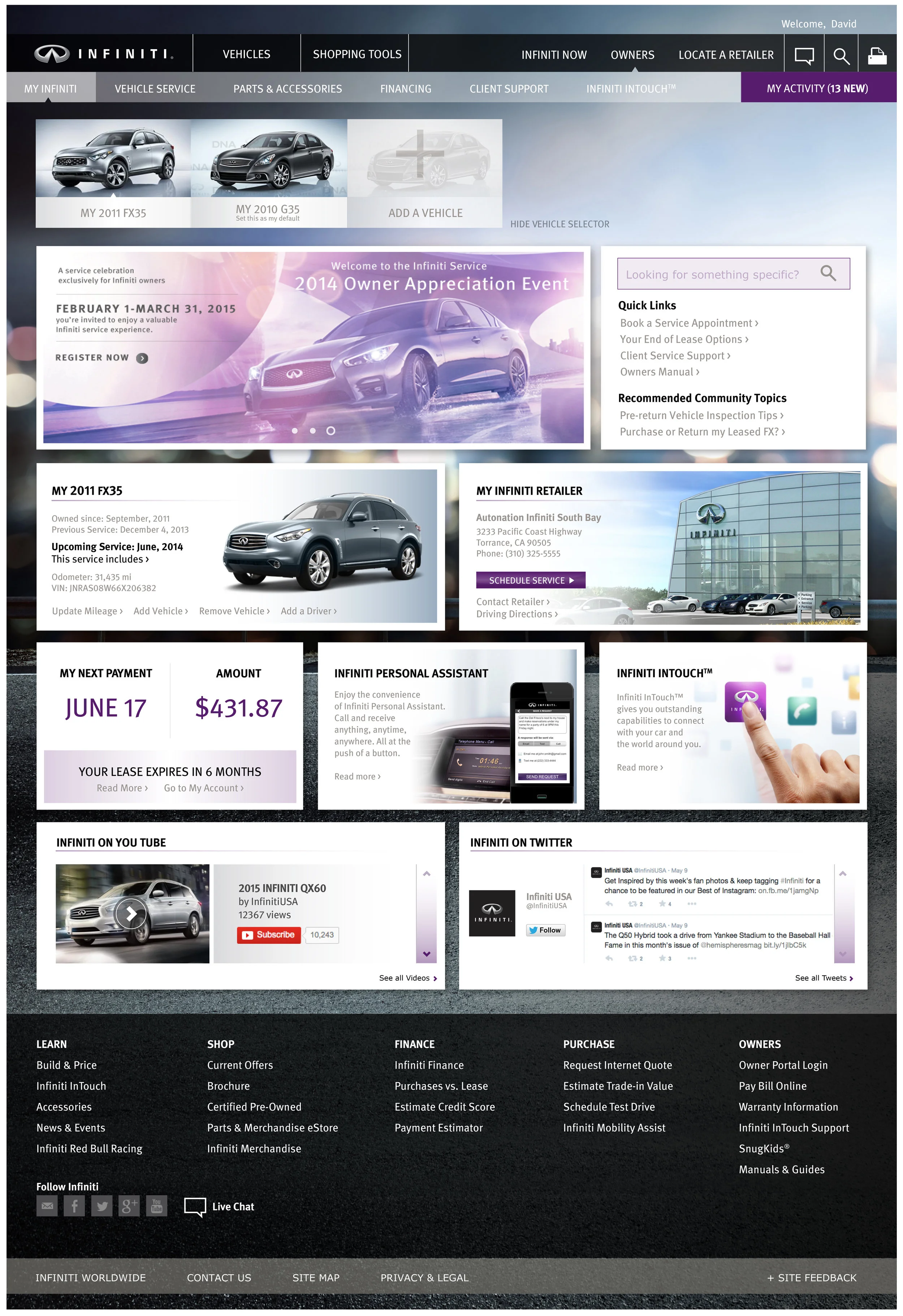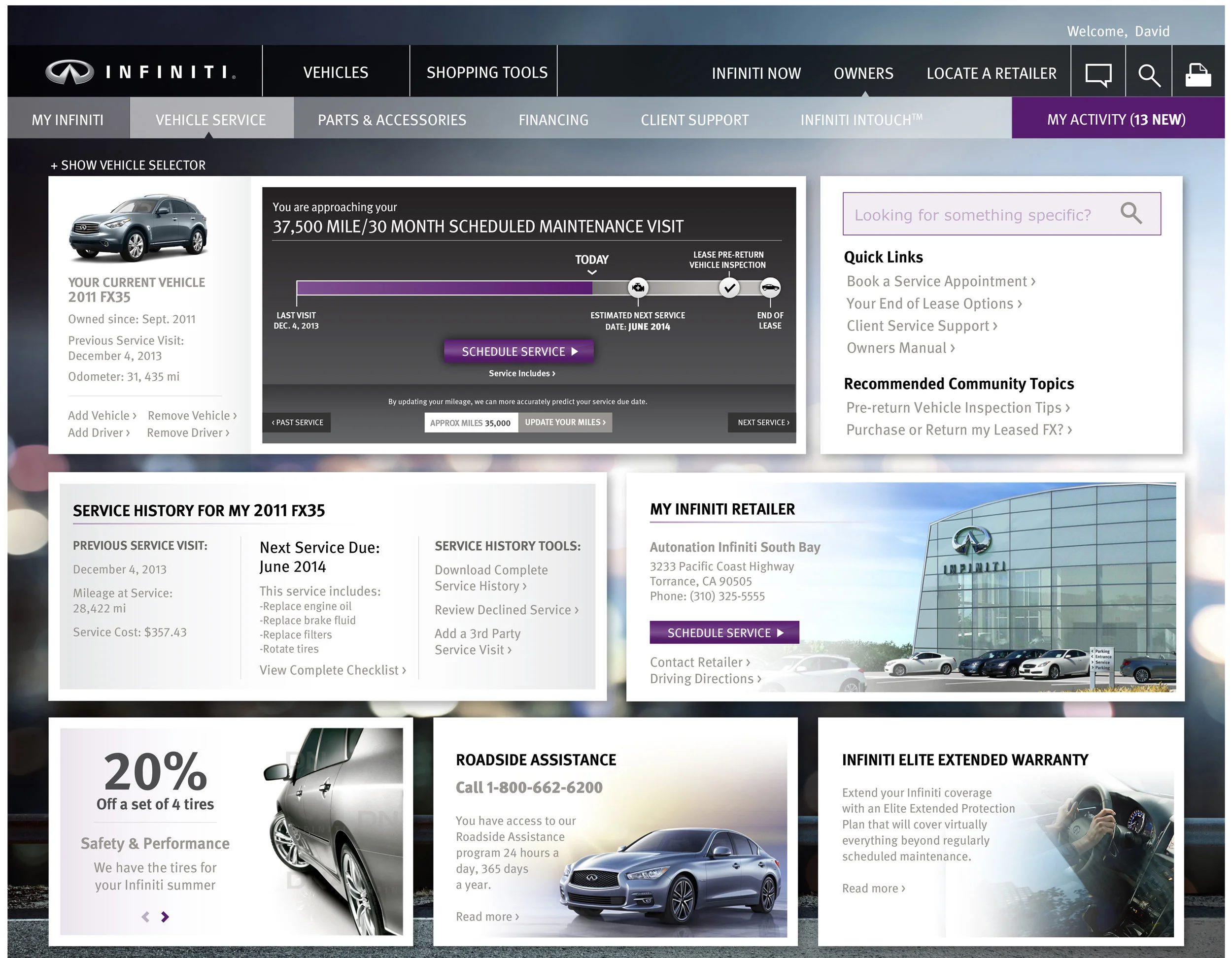 The Infiniti Owners' Portal is a website built just for owners and is separate from the corporate sales site. It makes it easy for owners to find the information that is relevant to them based on where they are in their ownership cycle. The page is designed with modules and as you navigate the site the modules change to serve up relevant information about your car.
