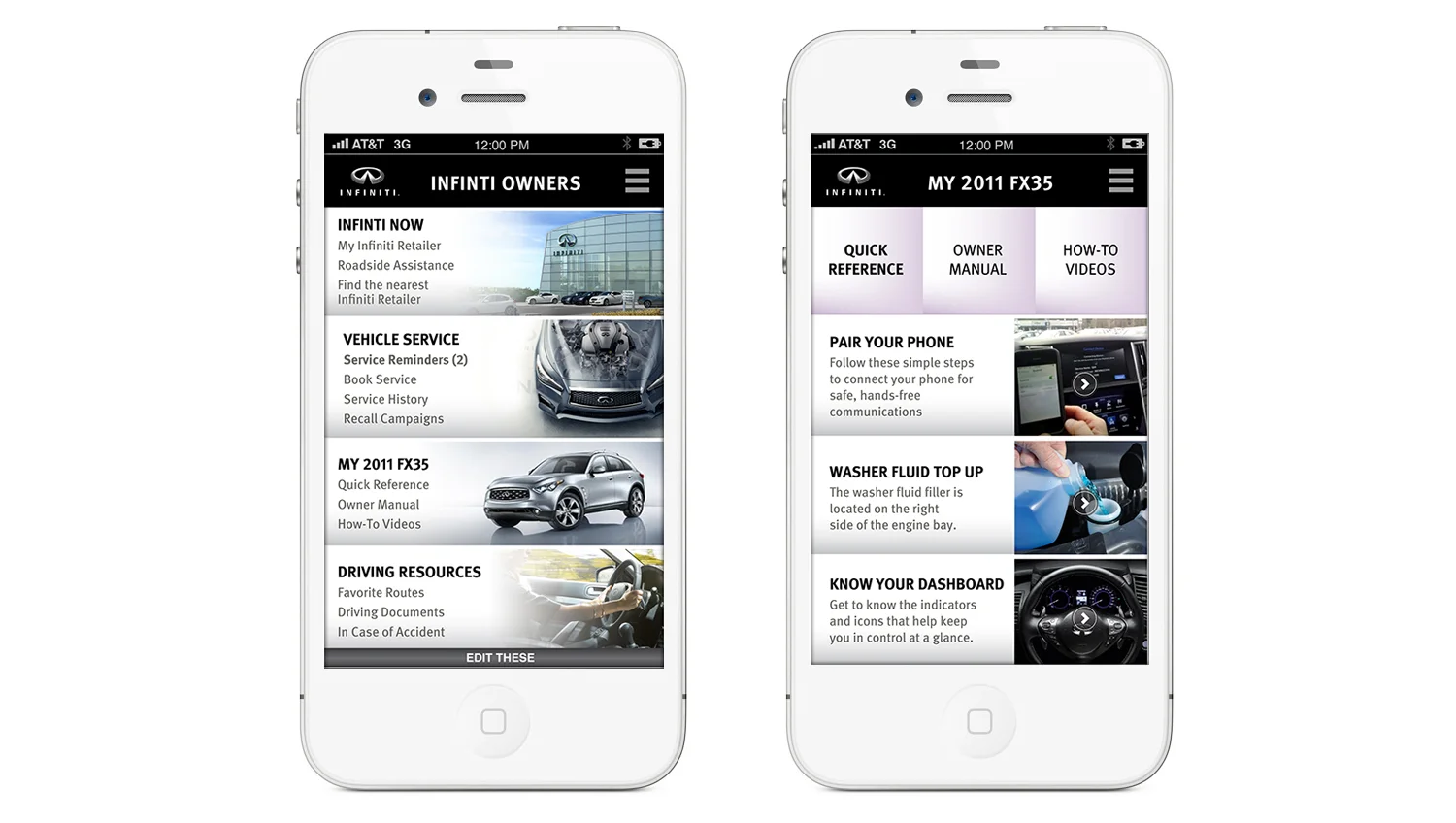 To accompany the Infiniti Owners' Portal above, we pitched the idea of having a mobile app. This would give owners quick access to customized content based on their vehicle.