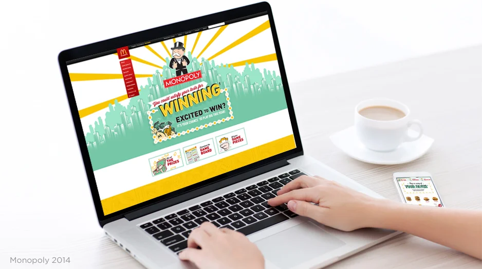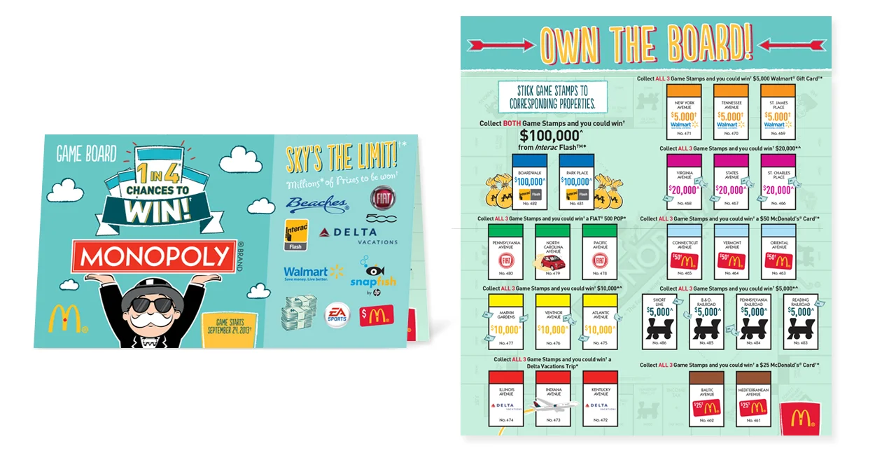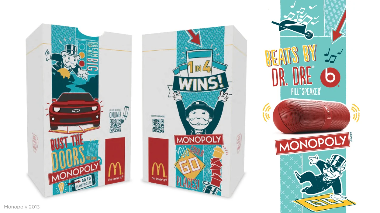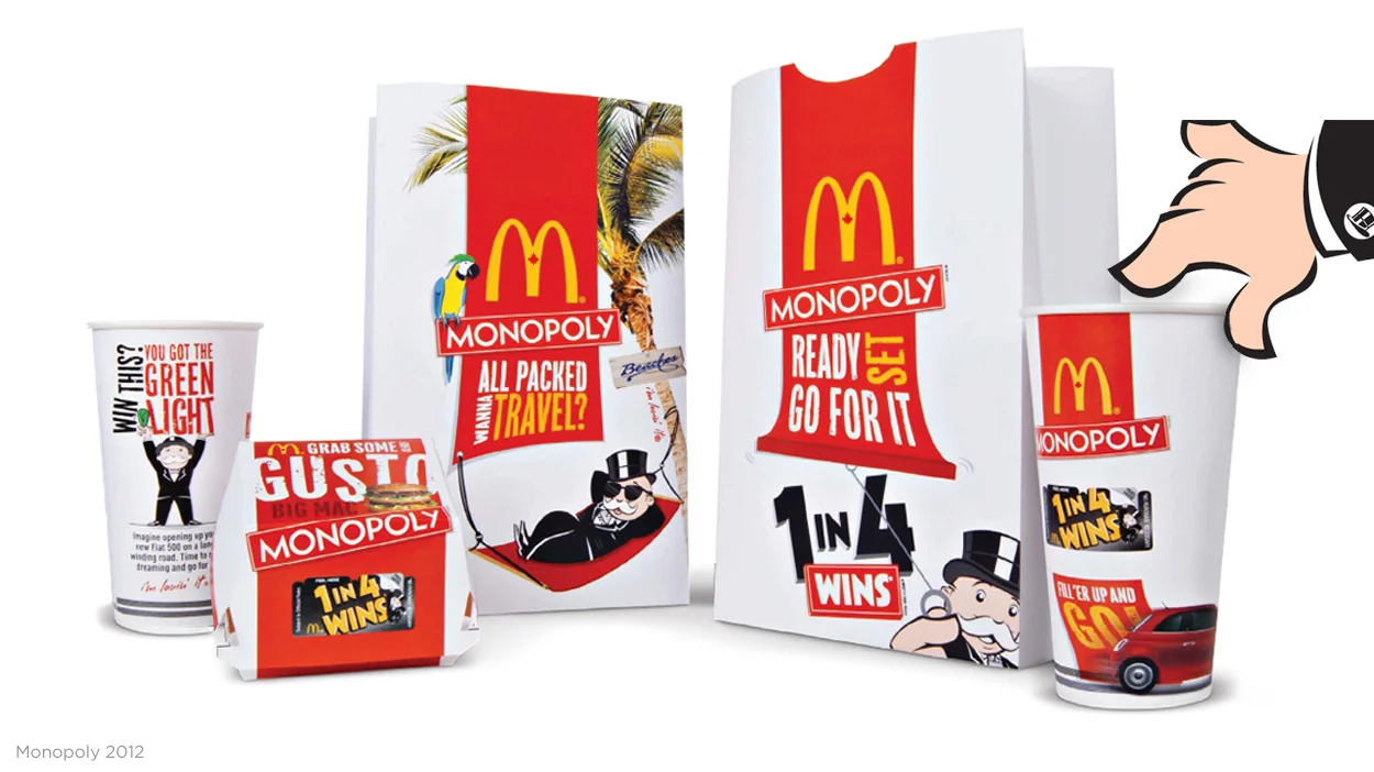 Monopoly at McDonald's is the world's biggest and longest running promotion around the world. Finding new ways to refresh the game each year is always an exciting challenge. With up to 18 pieces of unique packaging to design, as well as the game board, take-one box, tray liners, in-store ambience kit, and online concepts, there is plenty of opportunity to bring the creative platform to life each year.