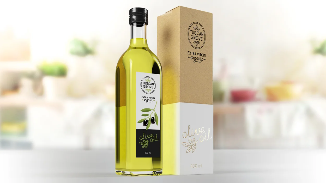 The Tuscan Grove project started with a logo design for the brand. The packaging design for Tuscan Grove Olive Oil is very simple and understated. The outer box is a natural craft paper stock that slides into a white half sleeve. The craft paper gives a nod to the organic nature of the oil, and the gold foil printing adds a touch of elegance. The bottle label features an olive leaf illustration, with custom typography.